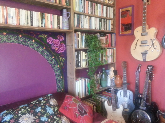 First a set of pine shelves, fitted to fill an entire wall in our spare bedroom. These shelves are actually old floorboards from a house that was being refurbished in Hanover, Brighton. They’re relatively new, fitted in the 1970s, and would otherwise have been taken to the dump.