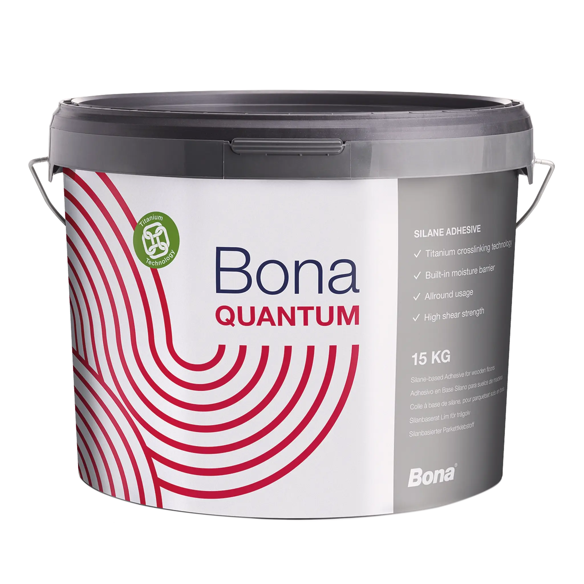 Bona Quantum is a crosslinking, silane-based flooring adhesive that can be used for the installation of most hardwood and engineered wood flooring including under floor heating systems. It provides better performance and is more economical than the older Bona R850/R850T flooring adhesives. 75% of this product is manufactured from recycled materials. Also available in a higher viscosity sausage as Bona Quantum T.