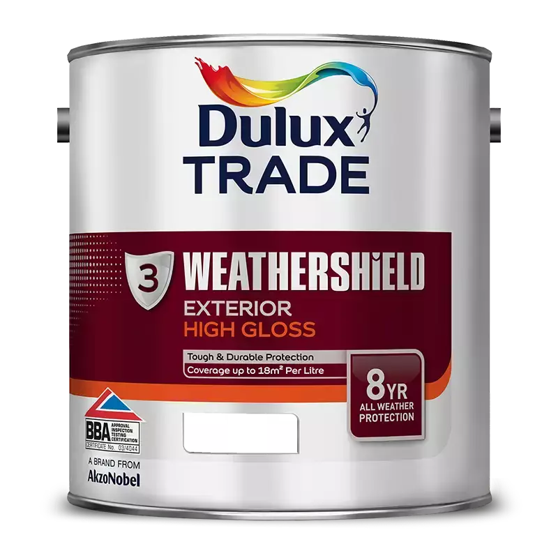 Dulux Trade Weathershield Exterior High Gloss is part 3, of a 3 part weather resistant and flexible paint system from Dulux Trade, specifically developed to give long-lasting, high gloss protection for exterior woodwork. It contains a fungicide to inhibit mould growth on the paint film and help it stay cleaner for longer, and provides 8 year weathering durability when used as part of the full Weathershield exterior paint system.
