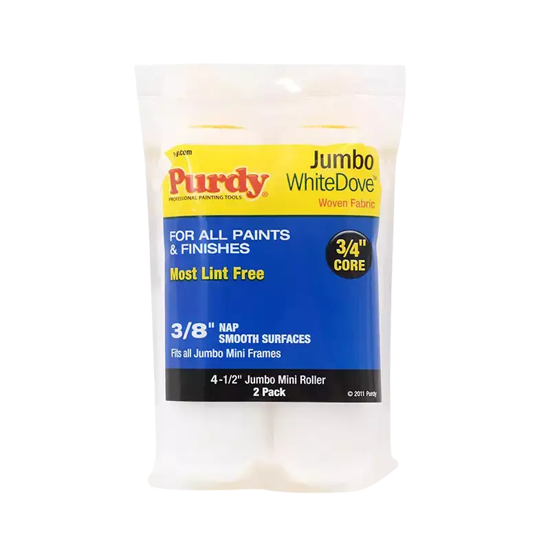 Purdy White Dove Jumbo Mini Roller Sleeve offers a lint free finish and gives a smooth application of paint, oil or wood stains. With having high density Dralon fibres combined with a short pile height of 3/8" produces a high retention of liquid whilst also aiding the lay off of paint and is compatible with 9" roller frames as well as Purdy Revolution Jumbo Mini Frame.