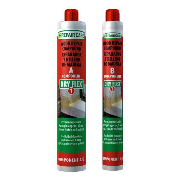 Repair Care DRY FLEX® 1 is a very quick drying, flexible repair compound for both emergency and permanent repairs on interior and exterior wood surfaces, such as windows, doors, stairs, furniture, fascias and soffits. Ideal for small, quick repairs with a thickness level of 5-15mm. Once set, it has excellent mechanical features, naturally moving like wood. It can be sanded and finished to match the surrounding area after 1 hour. Easy to use.