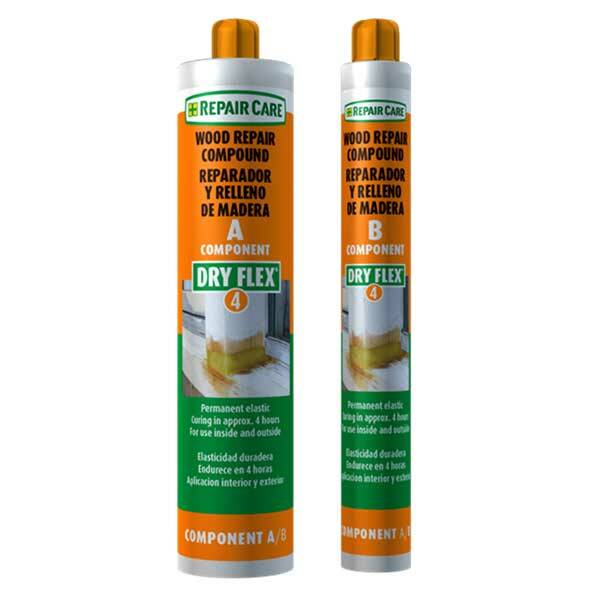 Repair Care DRY FLEX® 4 is a quick drying, flexible repair compound for both emergency and permanent repairs on interior and exterior wood surfaces, such as windows, doors, stairs, furniture, fascias and soffits. Ideal for small to medium repairs with a thickness level of 5-50mm. Once set, it has excellent mechanical features, naturally moving like wood. It can be sanded and finished to match the surrounding area the same day. Easy to use.