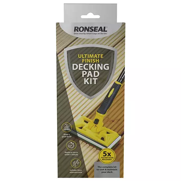 Ronseal Ultimate Finish Decking Pad Kit contains the tools needed for the upkeep and maintenance of oiled, stained and painted decking. The interchangeable cleaning and coating pads connect to the applicator head, and is ready to use in less than 1 minute.